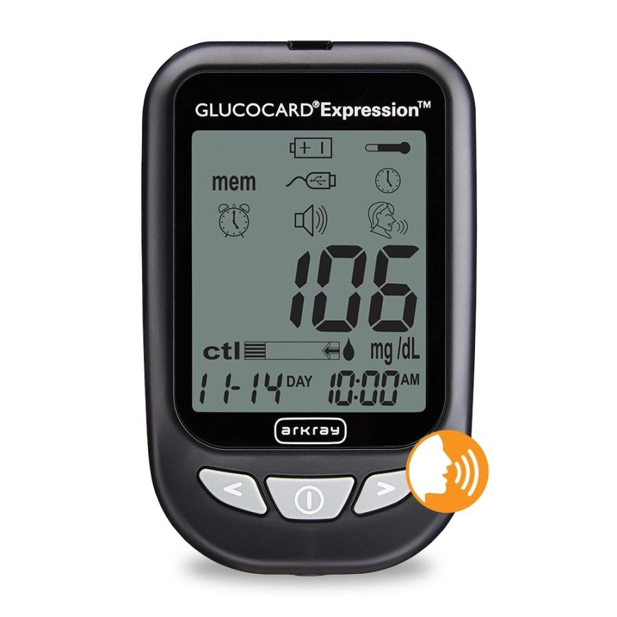 The GLUCOCARD Expression is an audio-enabled, auto-code Blood Glucose Monitoring System that includes bilingual voice features for hearing a test result. Oversized picture icons and large tactile buttons make this meter easy to use. Testing is more comfortable with a small sample size and alternate site testing. Accurate and reliable test results are displayed in six seconds. Powered by two “AAA” batteries the meter will perform 1,000 tests of continuous use. The downloadable memory holds 300 blood tests and the user can determine 7-, 14-, and 30-day averaging.