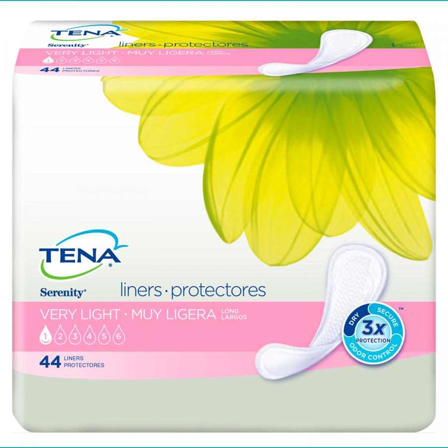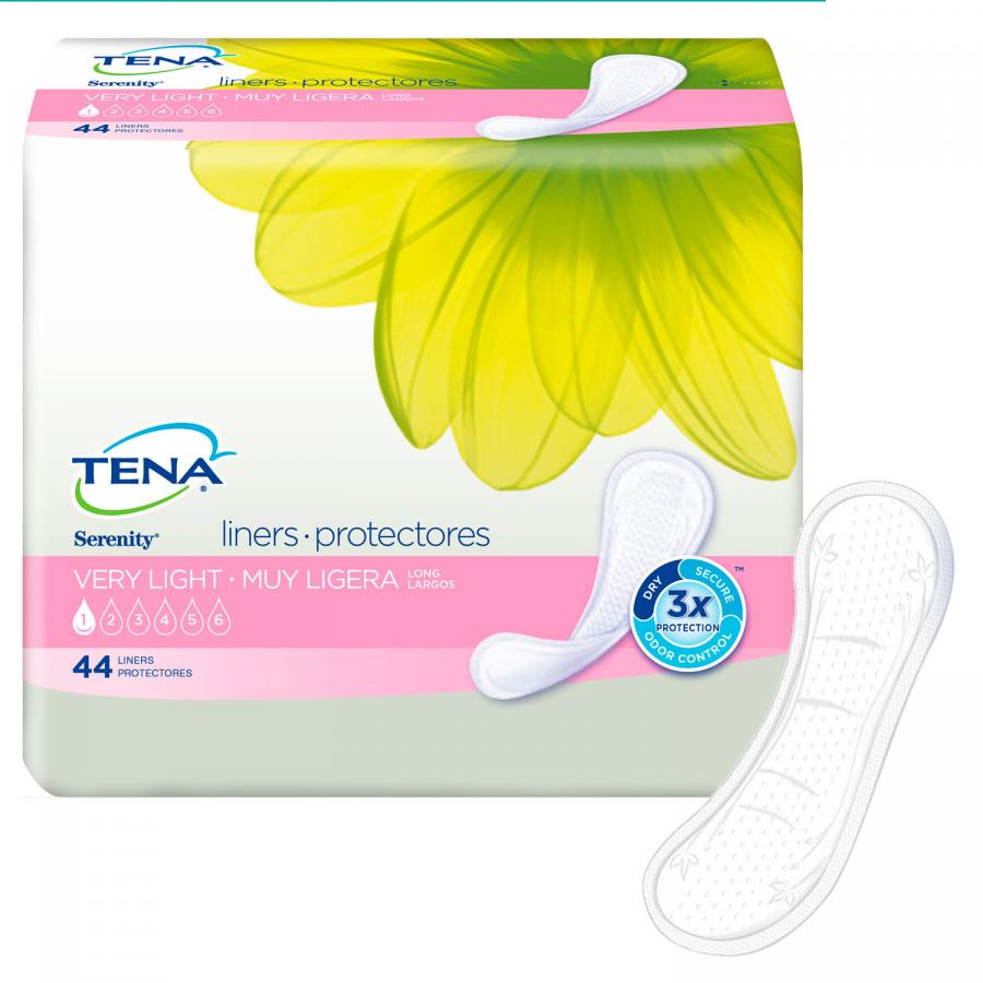 TENA Serenity Very Light Incontinence Liners are incredibly thin and discreet for everyday use and designed for very light leaks (such as losing a few drops of urine while coughing or laughing), but they'll protect you better than a regular feminine pantiliner so you stay dry no matter what. These liners feature a soft, cloth-like, quick-dry topsheet that pulls in liquid fast to keep you dry and comfortable; a Dry-Fast core with a super-absorbent polymer that quickly wicks away and helps trap liquid for effective leakage protection and odor control; cushiony side gathers designed to ensure a great fit by following your body's own natural contours; and an adhesive strip for secure fixation in your own underwear.