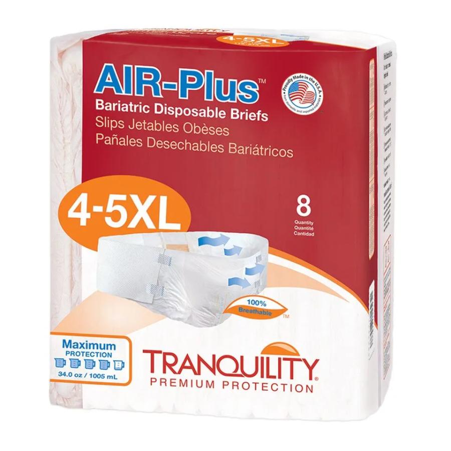Tranquility AIR-Plus Briefs are 100% breathable allowing for complete air circulation, and each portion of these briefs has microscopic pores that allow moisture vapor to escape for total comfort. Their stretchy, side panels extend to a circumference of 106 inches while their peach, absorbent core minimizes odor and holds over one quart of fluid for maximum protection. These briefs also feature a cloth-like outer layer; micro-hook closure tabs; Kufguards (inner leg cuffs) for leakage/bowel containment; and a dual wetness indicator and elastic leg gathers.