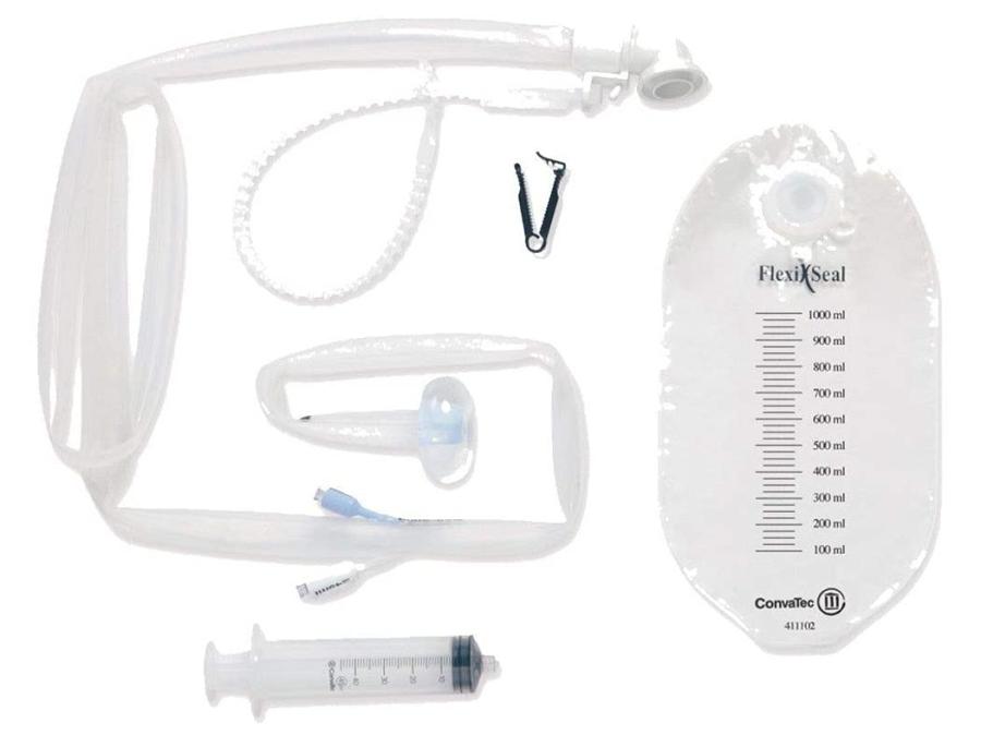 Flexi-Seal® SIGNAL™ FMS is a temporary containment device, indicated for immobilized, incontinent patients with liquid or semi-liquid stool. It is designed to safely and effectively contain and divert fecal matter, protect patients' wounds from fecal contamination and reduce both the risk of skin breakdown and spread of infection. The Flexi-Seal® SIGNAL™ Fecal Management System contains 1 soft silicone catheter tube assembly, 1 syringe, and 3 collection bags. At one end, the soft silicone catheter has a retention balloon that is inserted into the rectum. At the opposite end, the catheter has a connector for attaching the collection bag.