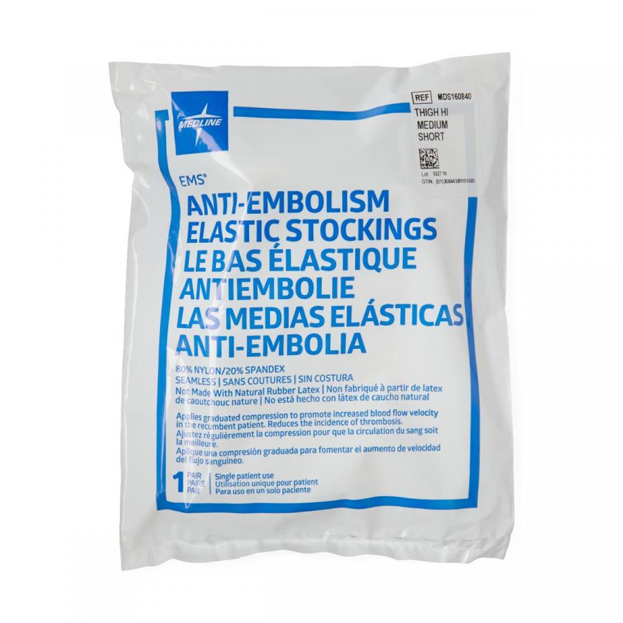 EMS Anti-Embolism Stockings are made of 80% nylon and 20% spandex for strength and stretch and provide a tailored, contoured fit with just the right amount of gradient pressure to optimize patient comfort; the pressure is greatest at the ankle and gradually reduces throughout the length of the leg (15-18 mmHg). Color coding at the toe and top band denote size and length for quick identification, and a measuring tape is included in each bag as well as in each box for help in finding the right fit.