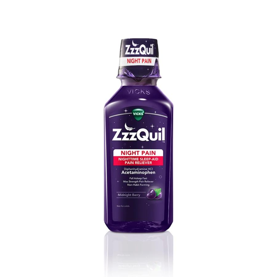 Vicks ZzzQuil Night Pain and Sleep Aid Liquid, Warm Berry Flavor, 1,000mg Acetaminophen and 50mg Diphenhydramine in 30mL, 1 Count, #80342356