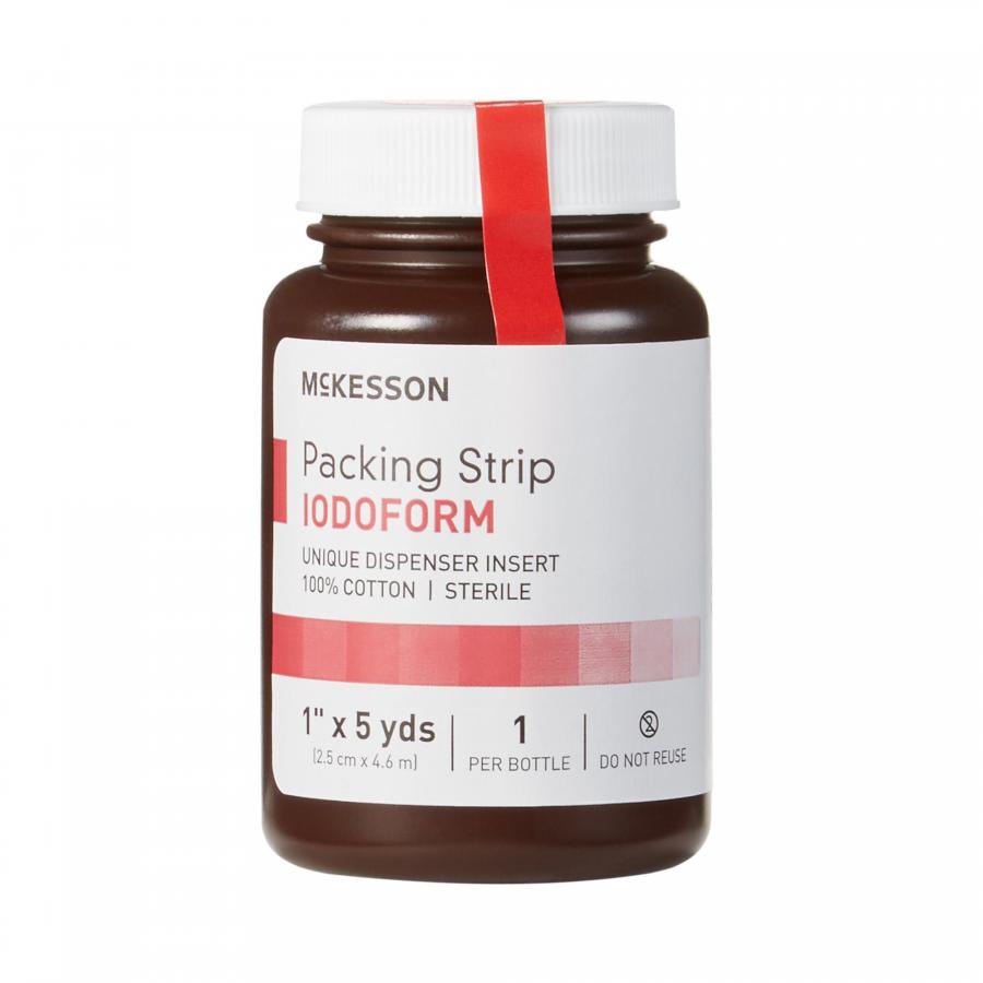 McKesson Iodoform Packing Strip provides an additional antiseptic property and is designed for nasal packing, dental packing, or as packing for open or infected wounds, and it is made of 100% cotton, ravel-resistant gauze designed to resist linting or fraying and comes in an easy dispensing package (patent pending) to help facilitate caregiver convenience.
